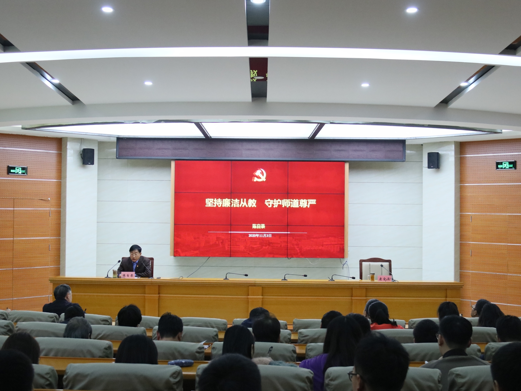为扎实开展廉洁教育,深入加强师德师风建设,11月3日下午,校纪委书记(监察专员)陈自录莅临色中色 ,以《坚持廉洁从教,守护师道尊严》为题作专题报告。色中色 教师及研究生党员130余人参加,报告会由党委书记康全玉主持。
