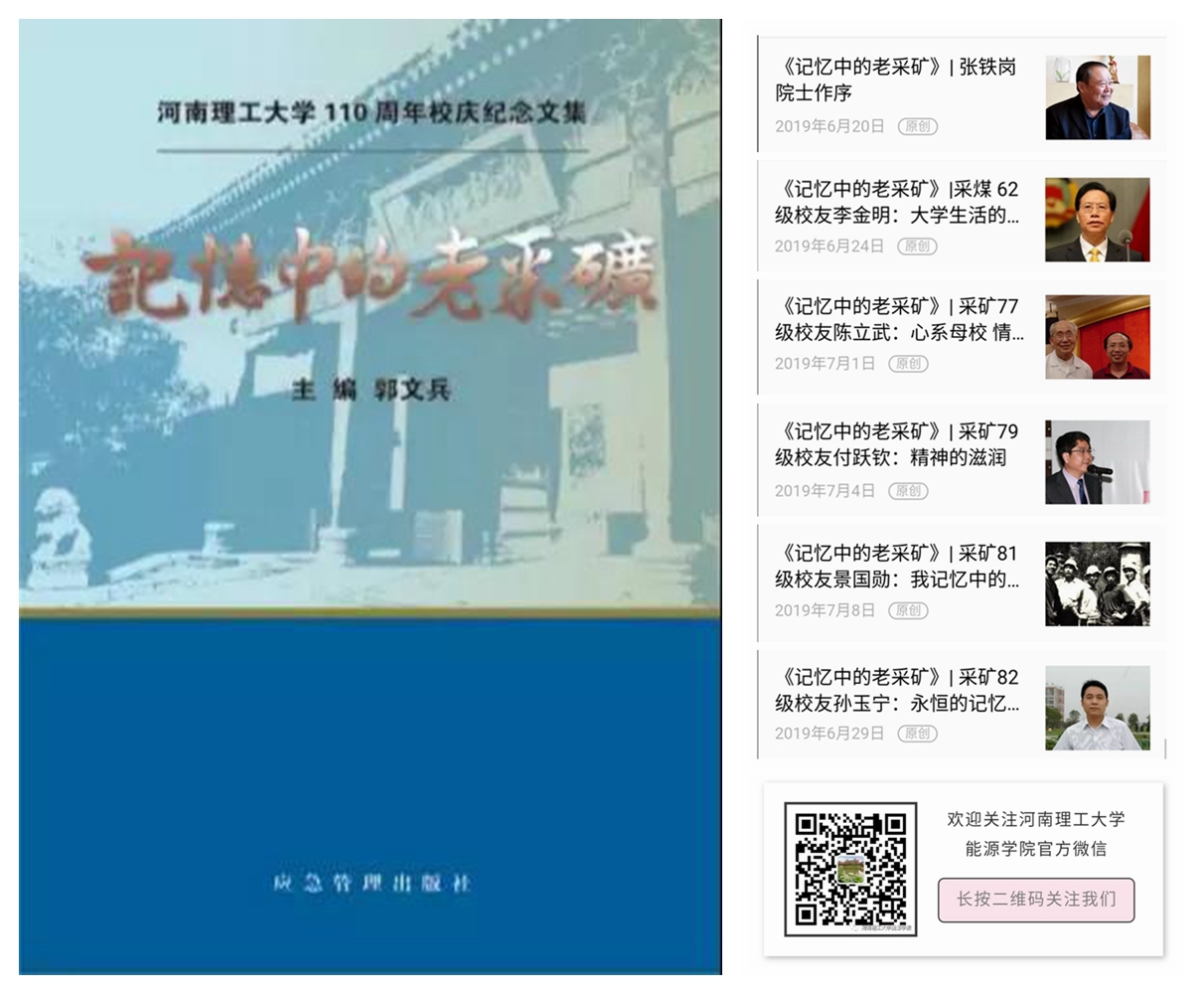 自《记忆中的老采矿》征稿启事发出以来,得到了广大校友的积极响应和支持。校友们纷纷打开封存已久的历史记忆、挥笔写下了那些难忘的历史片段,抒发对母校、昔日恩师、同窗好友的真情实感,情真意切。经过编纂工作组分类和初审,色中色 领导、采矿退休老干部、老教授等组成的审稿,作者本人修改完善,党委宣传部审核,最终收录了72篇(首)老采矿各届校友、老师发来的文章和诗词。与此同时,采矿62级校友、原浙江省政协主席李金明不仅深情撰文,还为本书提写了书名;采矿63级校友、河南省原常务副省长王明义撰文回忆了当年的老师和同学;采矿59级校友、原煤炭部总工程师尚海涛为本书题写了贺词;采矿62级校友、中国工程院院士张铁岗撰稿并作序;美国工程院院士、西弗吉尼亚大学原采矿系主任、现色中色 特聘教授Syd S. Peng亲笔为本书书写贺词;现已98岁高龄的原采煤系书记张明撰写回忆文章并提供一批珍贵的老照片;原采矿工程系柴一言主任深情回忆了当年实验室建设的艰辛和成就;原焦作工色中色 院长袁世鹰在此编纂过程中给予大力支持并提出了宝贵意见和建议;学校邹友峰书记、杨小林校长也非常关心本书的进展,多次进行指导。