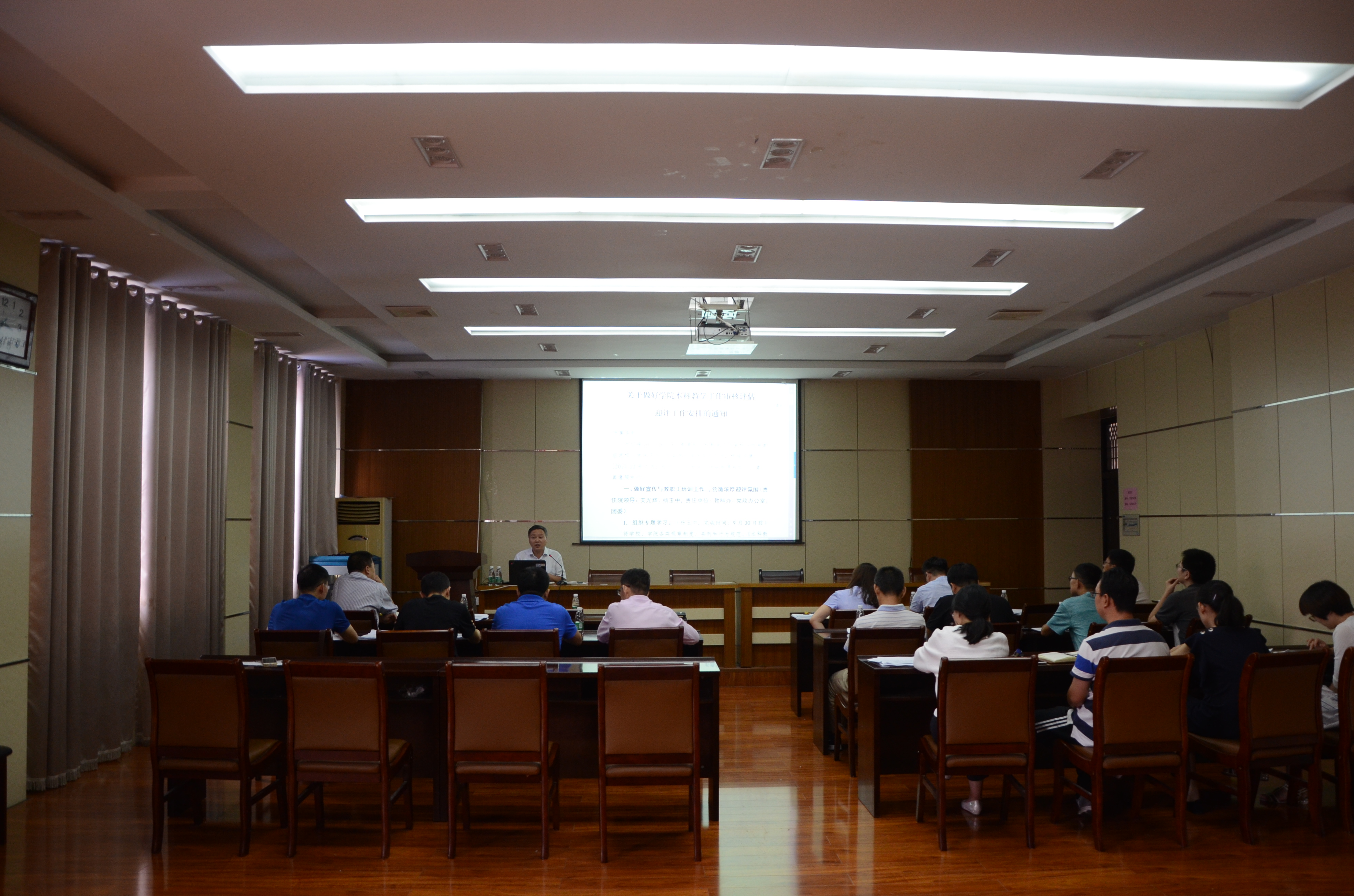 于院楼104学术报告厅召开本科教学工作审核评估迎评工作安排会。会议由院长郭文兵主持,院班子成员及全体教职工参加了本次会议。