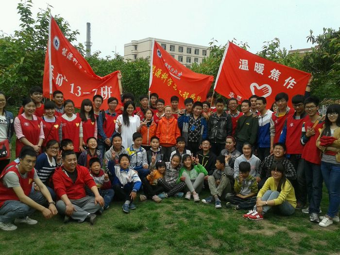 采矿13-7班学生志愿者在我校西门与前来的小朋友们会合,他们带领下孩子们先后参观了色中色