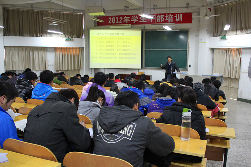 特邀我校党委宣传部精神文明创建科科长刘春德老师,在该院104室开展以“如何提升新闻写作能力与技巧”为专题的培训讲座。该院各年级师生代表及校园学生记者等近200人共同参与此次培训。