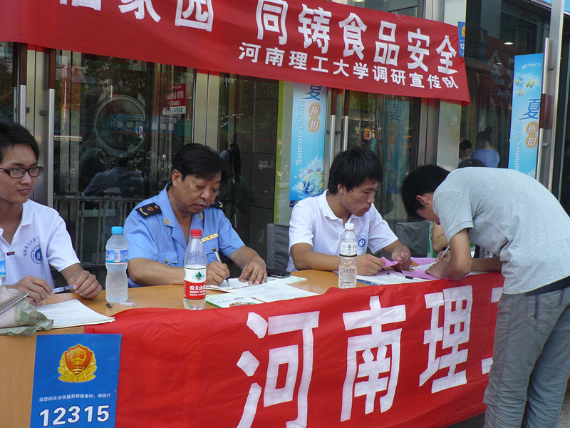 随后,围绕着此次活动的主题,队员们先是通过“共建诚信家园,同铸食品安全”的问卷调查了解过往市民的食品安全意识的程度,然后又通过悬挂宣传条幅、喷绘,发放食品安全手册、食品安全宣传单,口头讲解等方式针对怎样辨别食品安全以及政府新出台的一系列食品安全法规等方面内容向过往市民者进行宣讲。由于近几年来食品安全问题频频发生,人们的食品安全意识不断提高,食品安全问题也随之成为人们热议的话题,因而此次活动也因为过往市民的热情配合而取得了良好的效果,有些市民甚至参与到小组的宣讲活动中来,帮助队员分发传单,同队员们一起热情交流。