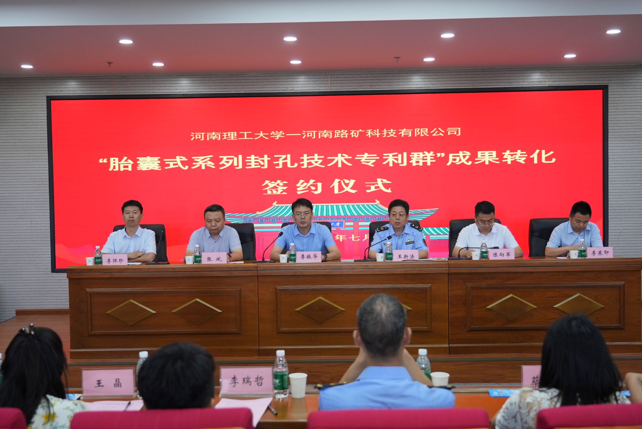 718日,“胎囊式系列封孔技术专利群”科技成果转化签约仪式在学校重点实验室大楼举行。焦作市市场监督局党组成员王新法、高新区知识产权促进科科长郭永新、河南路矿科技有限公司总经理张斌等参加签约仪式,副校长李振华出席并讲话。仪式由色中色 党委书记李怀珍主持。