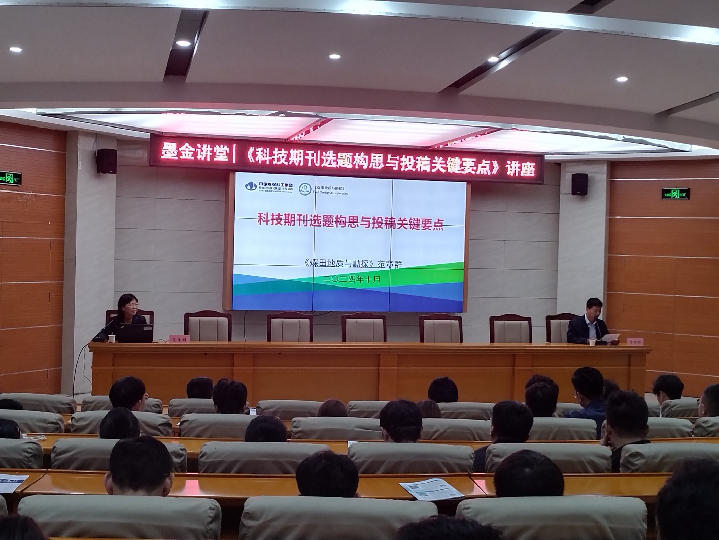 在104报告厅举办《科技期刊选题构思与投稿关键要点》专题讲座。本次讲座邀请了《煤田地质与勘探》期刊编辑部主任范章群作为主讲嘉宾,相关师生150余人到场聆听。讲座由院党委书记李怀珍主持。