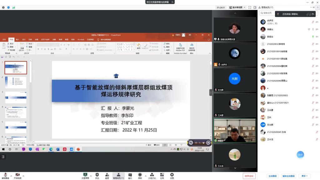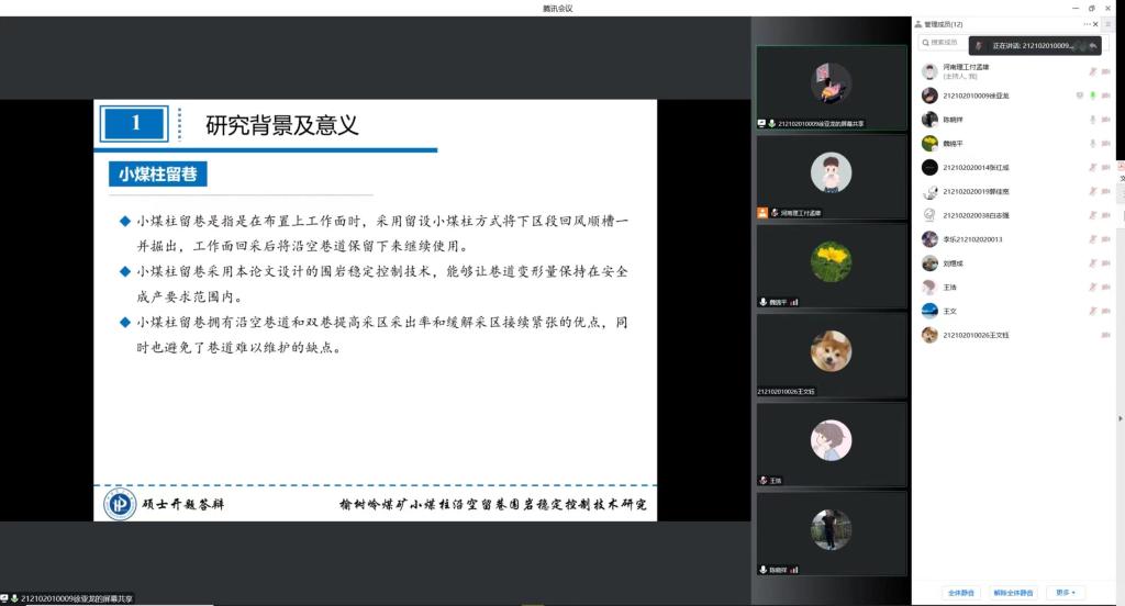 本次开题有30名矿业工程专业同学,69名资源与环境专业同学,20名交通运输专业同学参加,共成立13个学位论文选题审核专家小组。开题答辩会上,专家对论文的选题意义、国内外研究现状、研究方案、创新点等方面提出了意见和建议,并要求同学们尽快修改开题报告,按进度撰写论文。