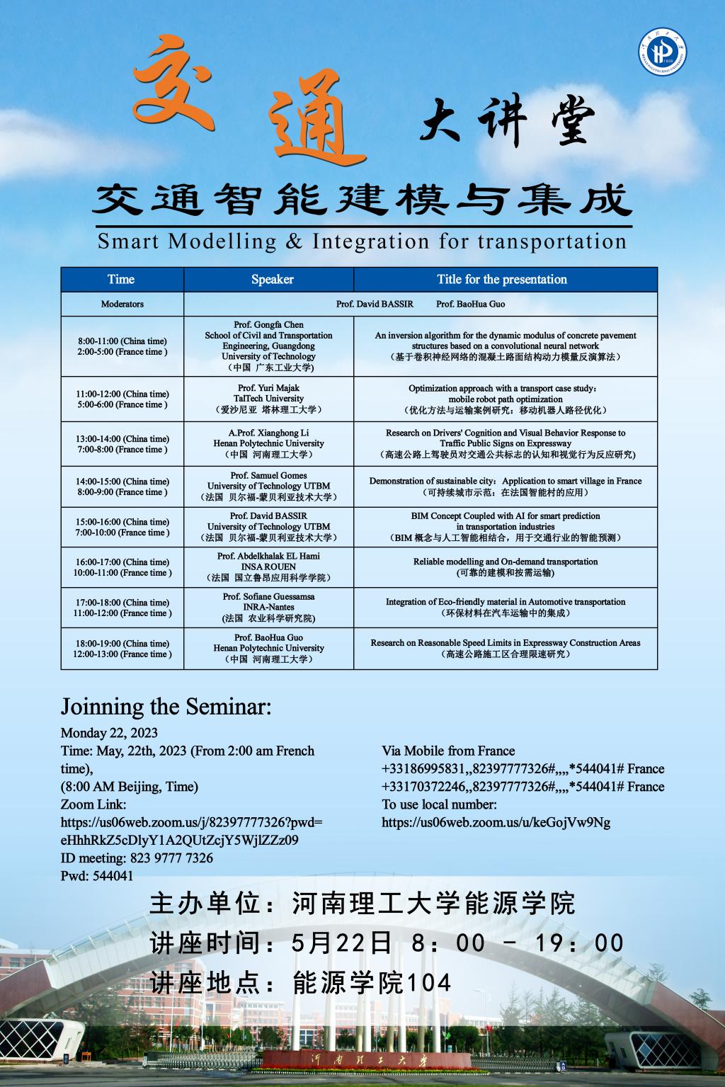 为切实提升交通运输学科建设水平,加强国际交流,拓宽国际视野,营造良好学术氛围,5月22日,由色中色 主办的交通大讲堂学术讲座在色中色 104学术报告厅举行。邀请了来自法国、爱沙尼亚、澳大利亚和中国的八位专家学者进行了“交通智能建模与集成”专题讲座。讲座采用线上和线下相结合的方式,由法国贝尔福-蒙贝利亚技术大学教授、色中色 特聘教授David BASSIR主持,交通工程系师生一百余人参加。