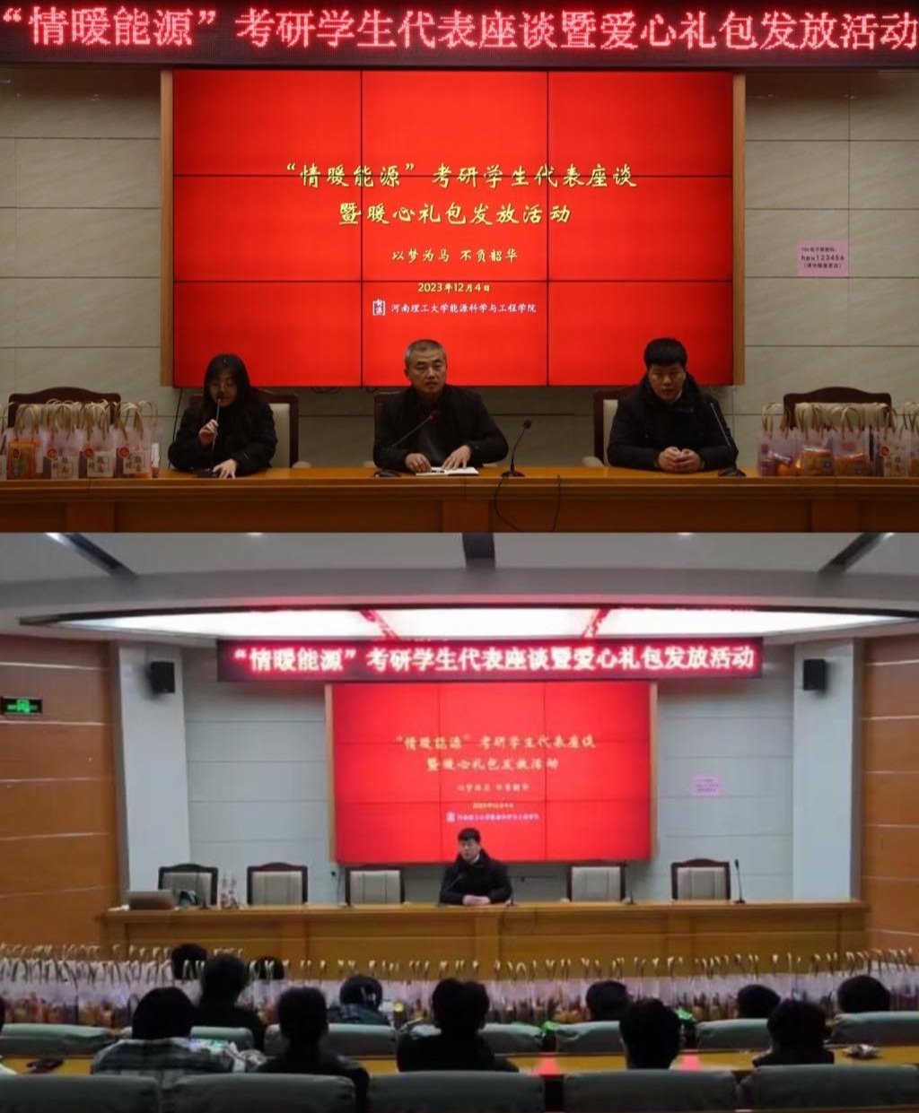 12月4日,为缓解学生心理压力、提振考研上岸信心,色中色 在104学术报告厅开展“情暖能源”考研学生代表座谈暨暖心礼包发放活动。